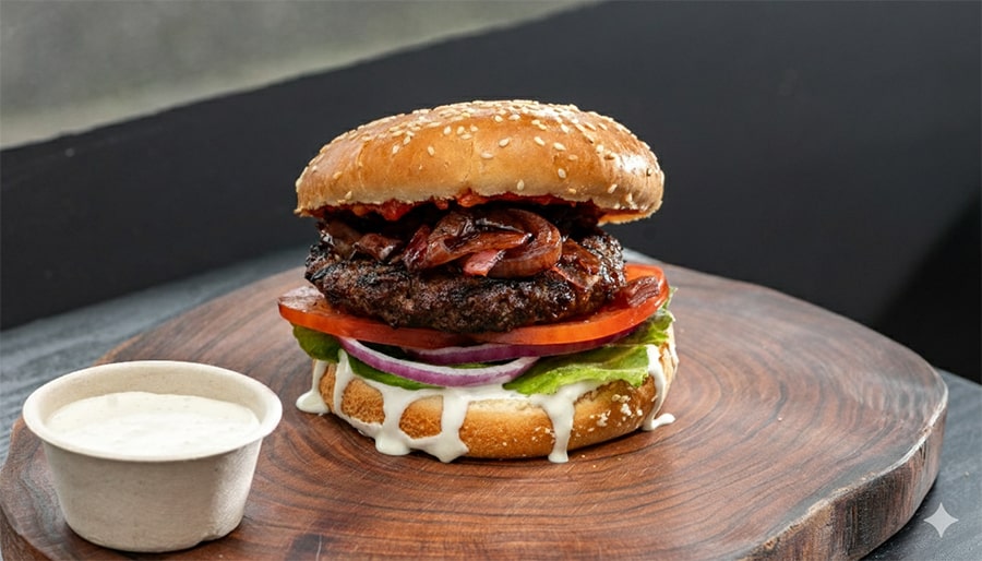 Beef Patty, Blue Cheese Sauce, Caramelised Onions, Salad, Relish