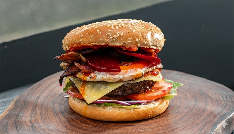 Beef Patty, Cheddar Cheese, Egg, Beetroot, Salad, Mayo, Relish, Bacon