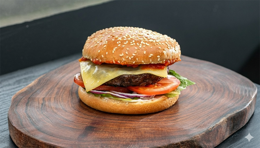 Beef Patty, Cheddar Cheese, Salad, Mayo, Relish